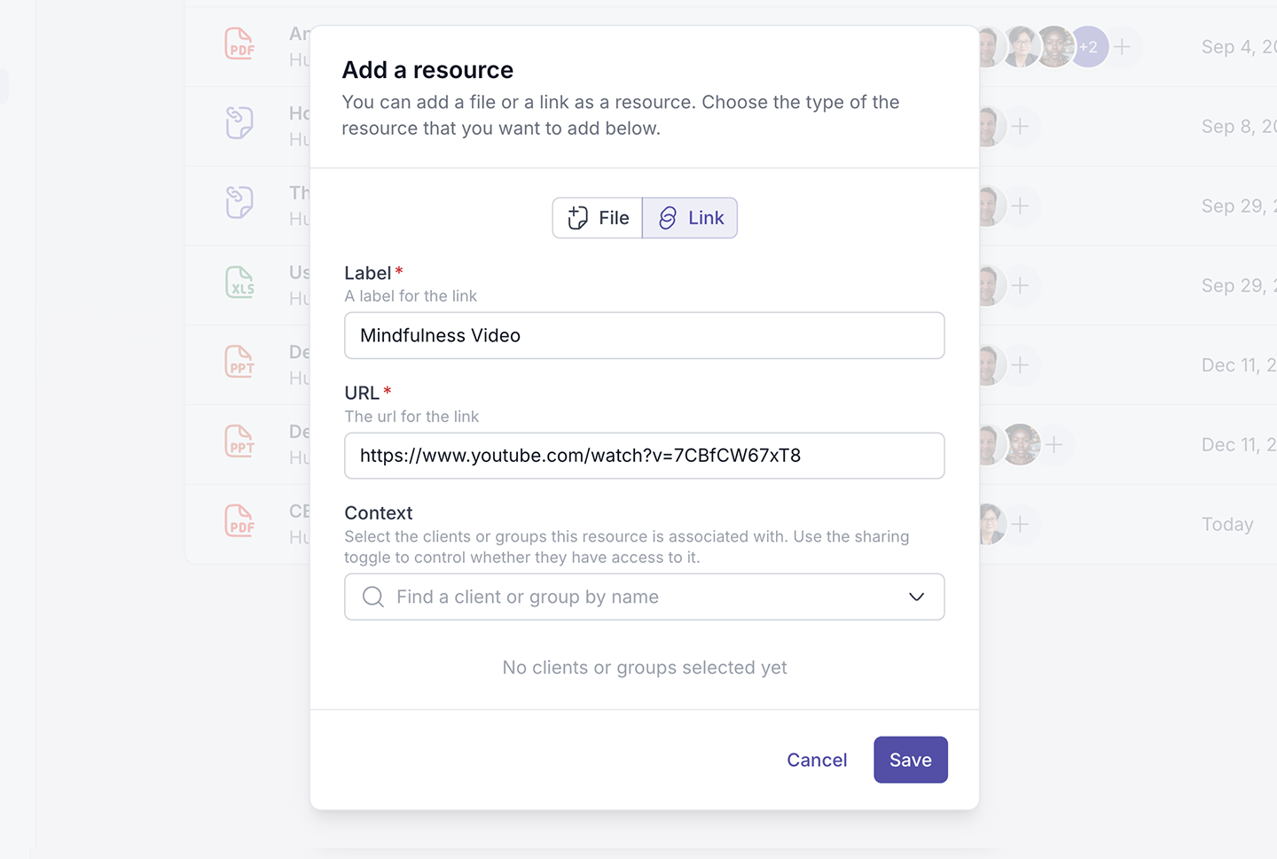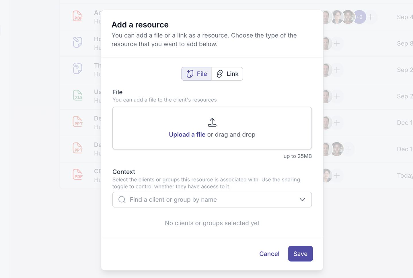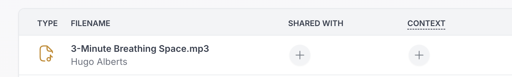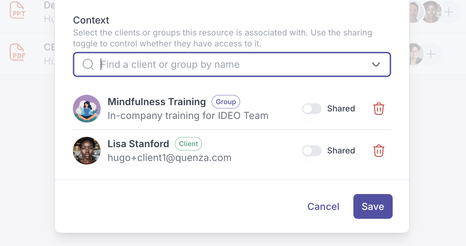 This shows the client or group the resource is associated with. Context means: Who this resource belongs to or is linked to inside your workspace. You can also click the + icon in this column to manage associations.