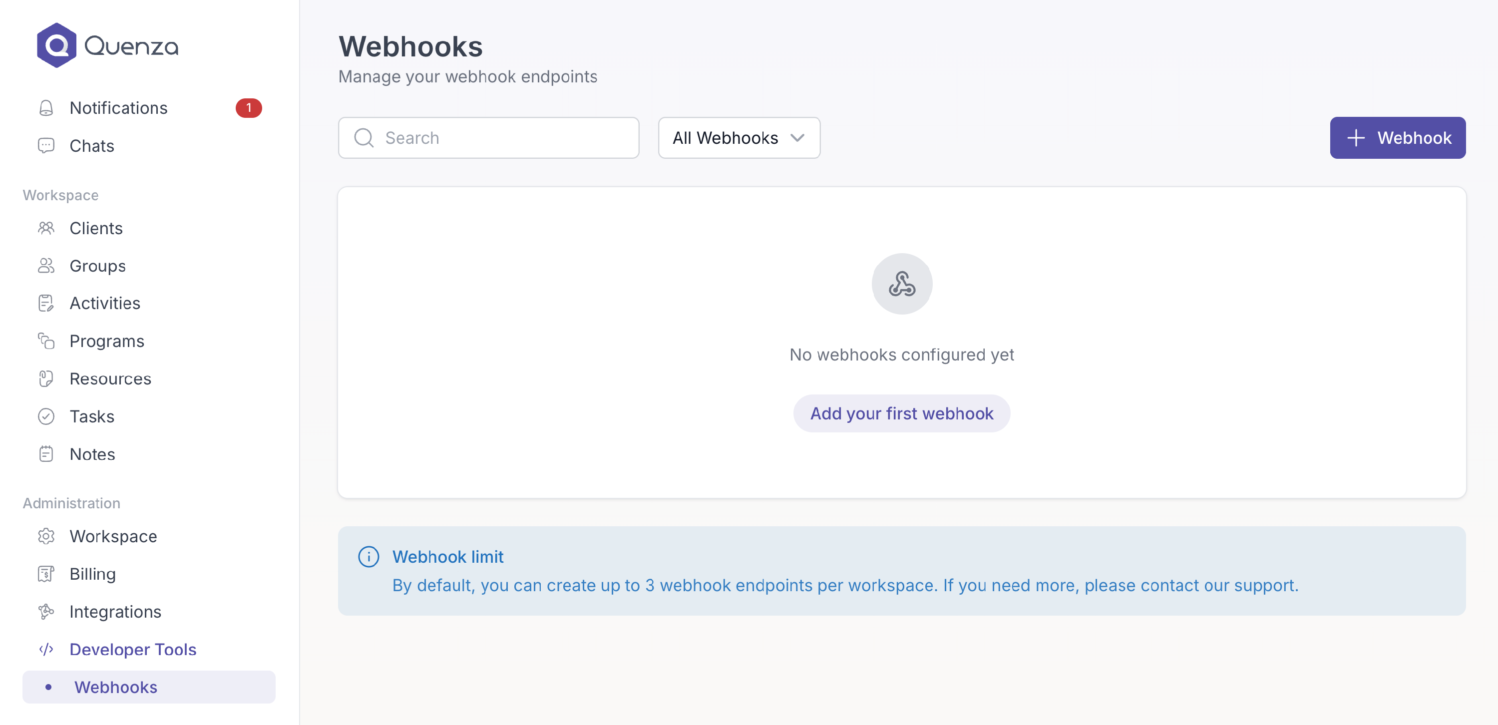 By default, you can create up to 3 webhook endpoints per workspace. If you need more, please contact Quenza Support.