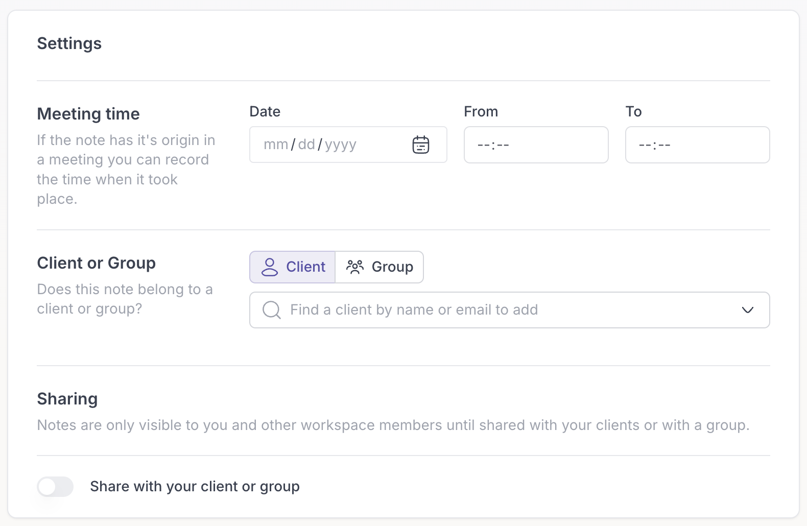 If you want to share a note with your client, simply toggle the Share switch on before saving. This is a great way to keep clients engaged and give them a written summary of your work together. Shared notes are visible in the client’s app, and the client will be notified when a new one is available.