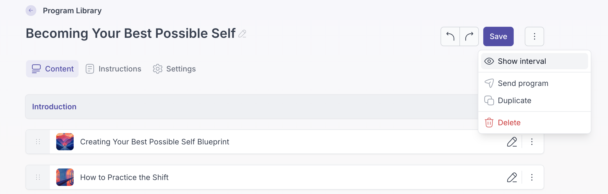 When intervals are shown, you’ll see the specific delays or timing between each activity, which helps you visualize the flow and pacing of your program. When intervals are hidden, the program list appears cleaner and more compact, ideal when you want a simple, uncluttered overview of your content. This setting affects only how the program appears in the builder and does not change the actual delivery timing for your clients.