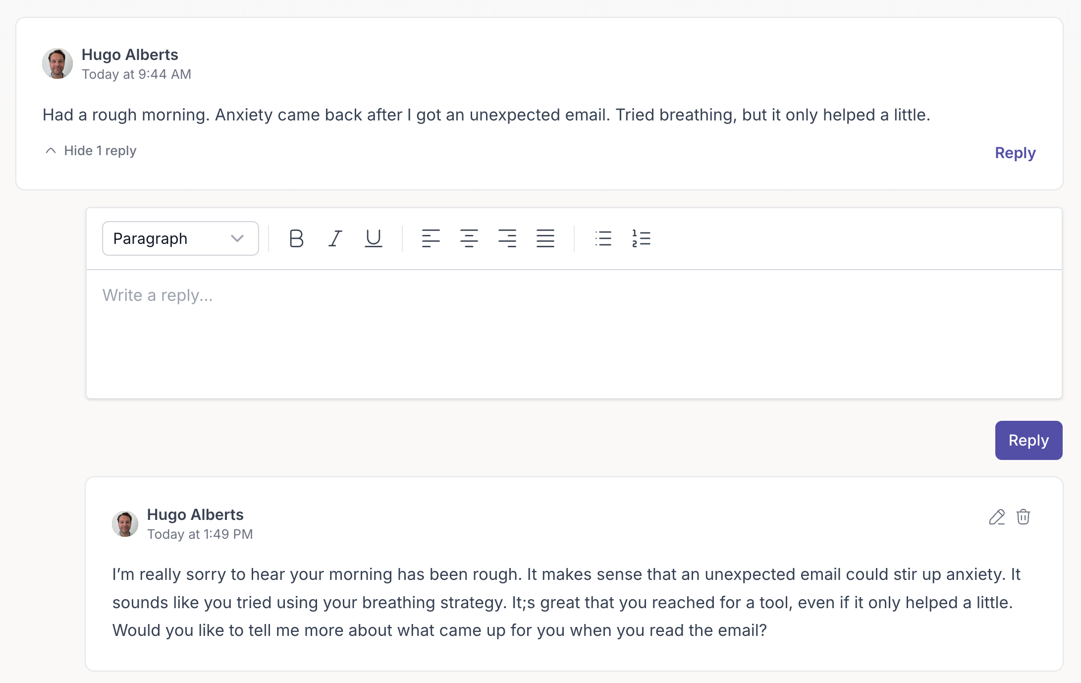 - Write your reply. Type your message in the text field and click Reply again to post it.
