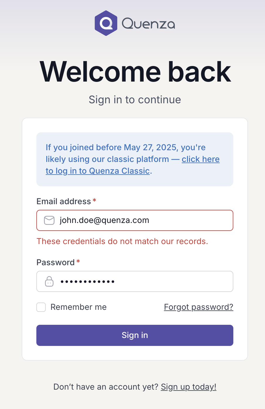 If you're a Classic user and accidentally navigate to the NextGen login (https://my.quenza.com/login), your credentials won't work - even if they're correct - because your account doesn't exist in NextGen.
