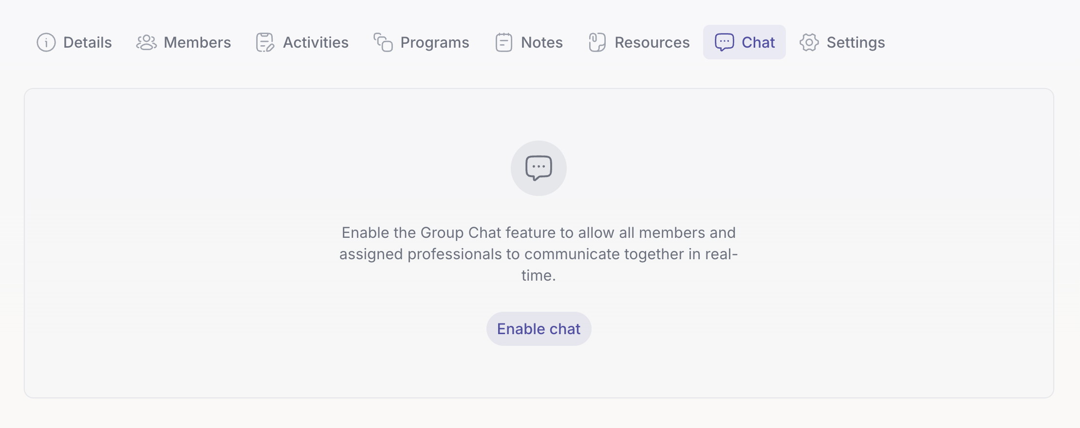 Group Chat is not turned on automatically because you may not always want group members to communicate with each other. In some cases, you may want communication to remain one to one, you may be using the group only for content delivery, or you may want stricter boundaries. By requiring explicit activation, Quenza gives you full professional control.