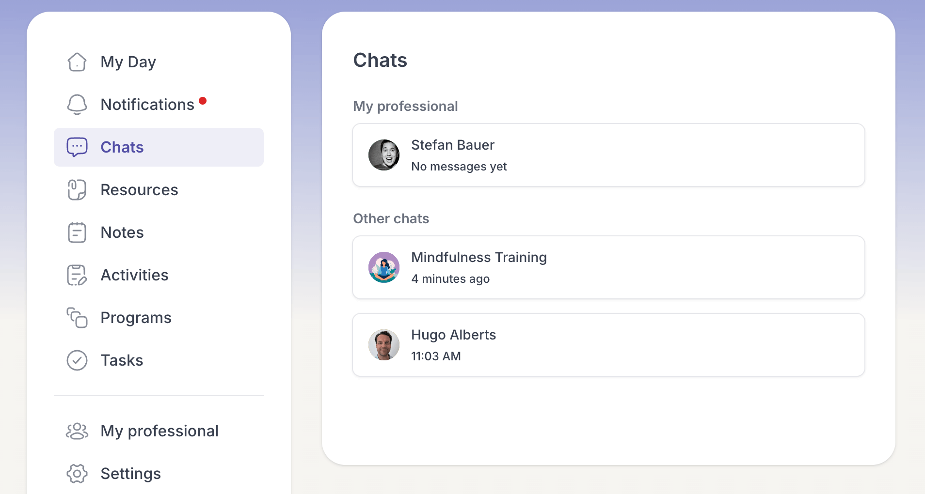 Only professionals who are assigned to the group can participate in the group chat. Professionals who are not assigned can view the group but cannot join the conversation. This ensures clarity, responsibility, and confidentiality.